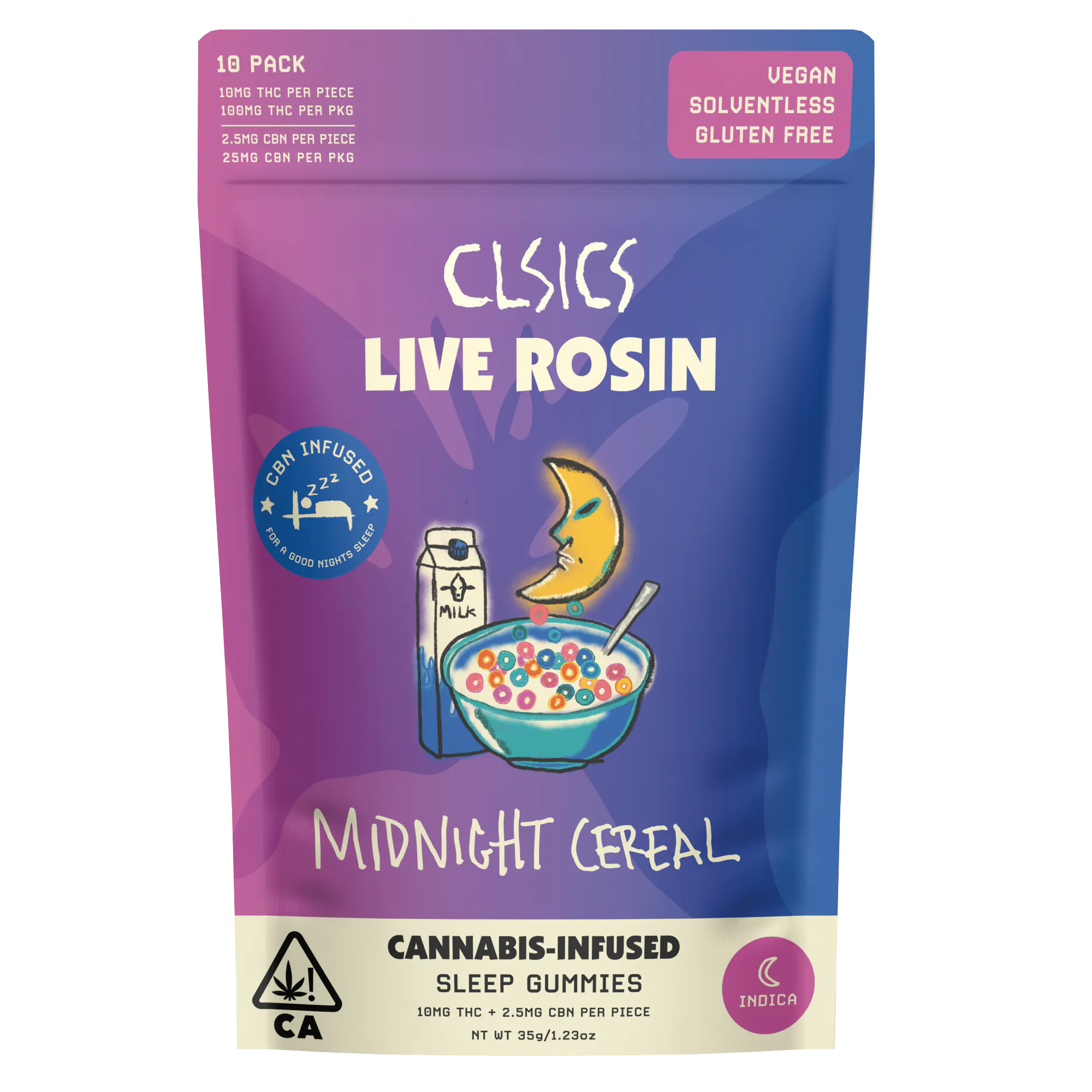 100% SOLVENTLESS and made with all-natural ingredients, no artificial coloring, and or flavoring, each gummy is infused with high quality LIVE ROSIN cannabis oil to provide a superior experience when compared to "regular” THC gummies. Our Midnight Cereal gummies contain CBN for a better night sleep.