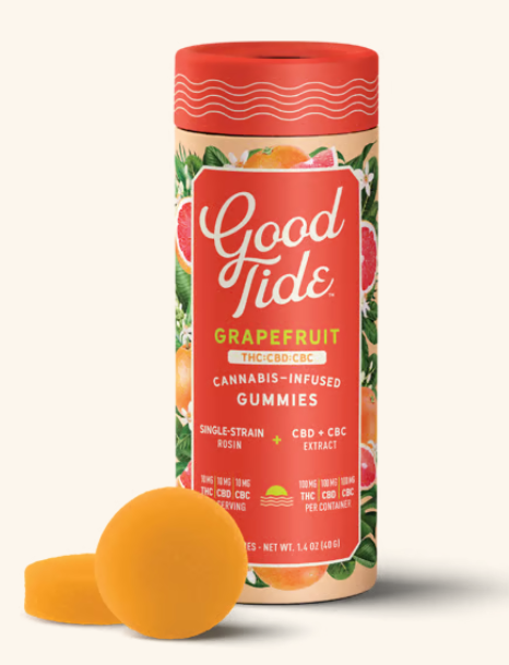 Good Tide Grapefruit THC:CBD:CBC gummies pair a Sativa single-strain rosin with the mood-boosting effects of CBC for citrusy, decadent treat that will get you a front row seat to bliss.