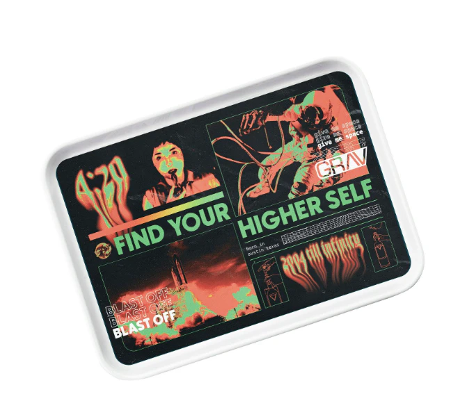 Made from sturdy melamine, this tray provides a clean and flat surface for rolling and keeps your tools and herbs organized. With its rounded edges, everything stays in place, preventing spills and mess. Featuring our signature "Find Your Higher Self" artwork, this tray is a statement piece that brings a touch of retro cool to your smoking ritual. Measuring 7.5 inches by 5.5 inches, it's compact and easy to store. Upgrade your rolling experience with our high-quality, durable rolling tray. Specs: Compact yet spacious enough to hold all your rolling supplies. Material: Melamine Artwork: "Find Your Higher Self" Size: 7.5 inches x 5.5 inches Works better than an old Frisby