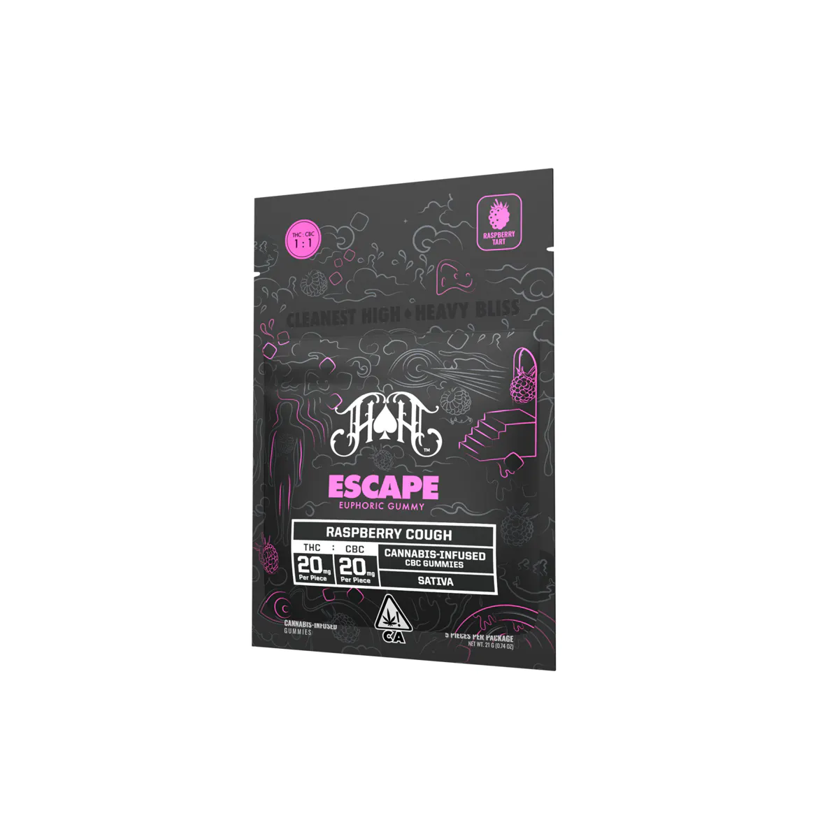 "Escape into balanced bliss with a ruthless, rare-cannabinoid remedy of euphoria. Introducing the Heavy Hitters CBC Raspberry Euphoria Gummies. Meticulously crafted with a pure, potent, and synergistic 1:1 ratio, each gummy features 20mg of THC enhanced with CBC for those in search of a heavy euphoric jolt.