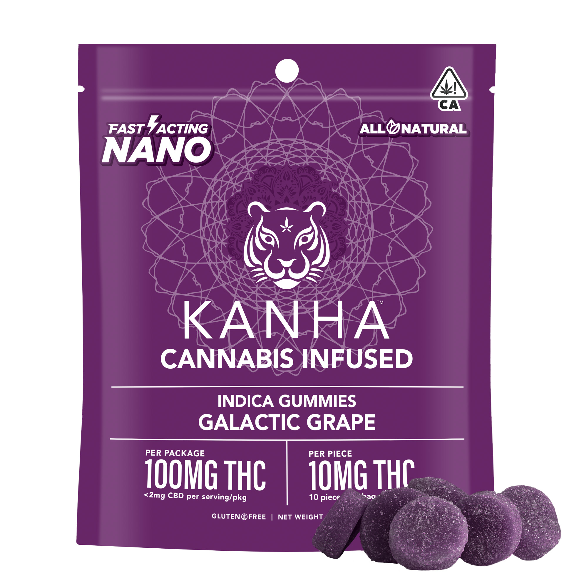 Who needs wine when Galactic Grape Indica gummies deliver the flavor of harvest-ready grapes with reserve-worthy indica oil and terpenes like myrcene, α-humulene and β-caryophyllene. Each soft and juicy gummy contains 10mg of THC and our exclusive NANO technology for faster takeoffs that send you into orbit in minutes. KANHA, the first to introduce fast-acting effects, remains the best with NANO gummies.