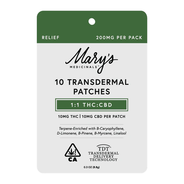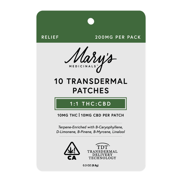 Mary’s award-winning Transdermal Patches are now available in a 10-pack for everyday self-care. Each 10-pack of Mary's Patches contains 2x2" squares that simply adhere to any veinous part of the skin, providing 8-12 hours of discreet systemic relief. Our Relief Transdermal Patch, with a 1:1 CBD:THC ratio, is designed to promote relief from common aches and pains in your daily life. Our Everyday Relief products are formulated with natural ingredients that provide systemic relief from daily stressors. Winner of the 2023 Michigan and SoCal High Times Cups, Mary’s Medicinals Relief Transdermal Patch is sure to be a winner in your book as well.
