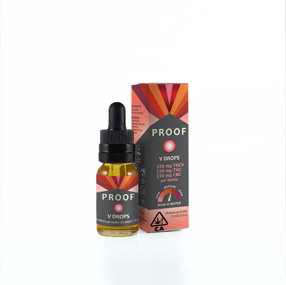 Proof V Drops feature the cannabinoid THCV for an alert and ecstatic experience. Paired with CBG & THC, this formula is designed to uplift and energize. We recommend it for exploration, creativity, and intimacy.